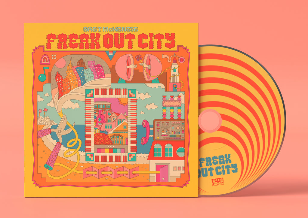 Around the same time The Flight of the Conchords emerged from this prolific Wellington artistic community and Bret spent several years touring comedy festivals in Australia, Canada and the UK with his bandmate Jemaine. They made a radio show for the BBC followed by a TV show for HBO that became a cult classic and propelled the pair to international fame. They released one EP and three albums with Sub Pop Records winning the Grammy Award for Best Comedy Album in 2008. Bret’s work with Flight of the Conchords established him in the entertainment worlds of both comedy and music and opened the doors to working in the American film industry. He has consistently worked on film and television projects since. In 2012 he won the Academy Award for Best Original Song for his ballad “Man or Muppet” from the Disney film The Muppets. During this time Bret and his wife Hannah Clarke had three children, and Bret started to focus on projects that would allow him to be at home in New Zealand with his family. In 2022 Bret released a solo album called Songs Without Jokes that saw him explore songwriting without punch lines. FarOut Magazine described the songs as “like musical versions of a Kurt Vonnegut novel.” This year he is releasing his second solo record, Freak Out City, made up of songs developed while on the road with his eight-piece band. Freak Out City was recorded in both Los Angeles and New Zealand, and co-produced by Bret and his long time collaborator Mickey Petralia. It was mixed by Michael Harris in Los Angeles at East West Studios. The musicians on the record are a mix of Los Angeles players Leland Sklar, Dean Parks, Drew Erickson, Chis Caswell, Joey Waronker and New Zealand musicians Ben Lemi, Leo Coghini, Jacqui Nyman, Moana Leota, Iris Little, Justin Clarke.